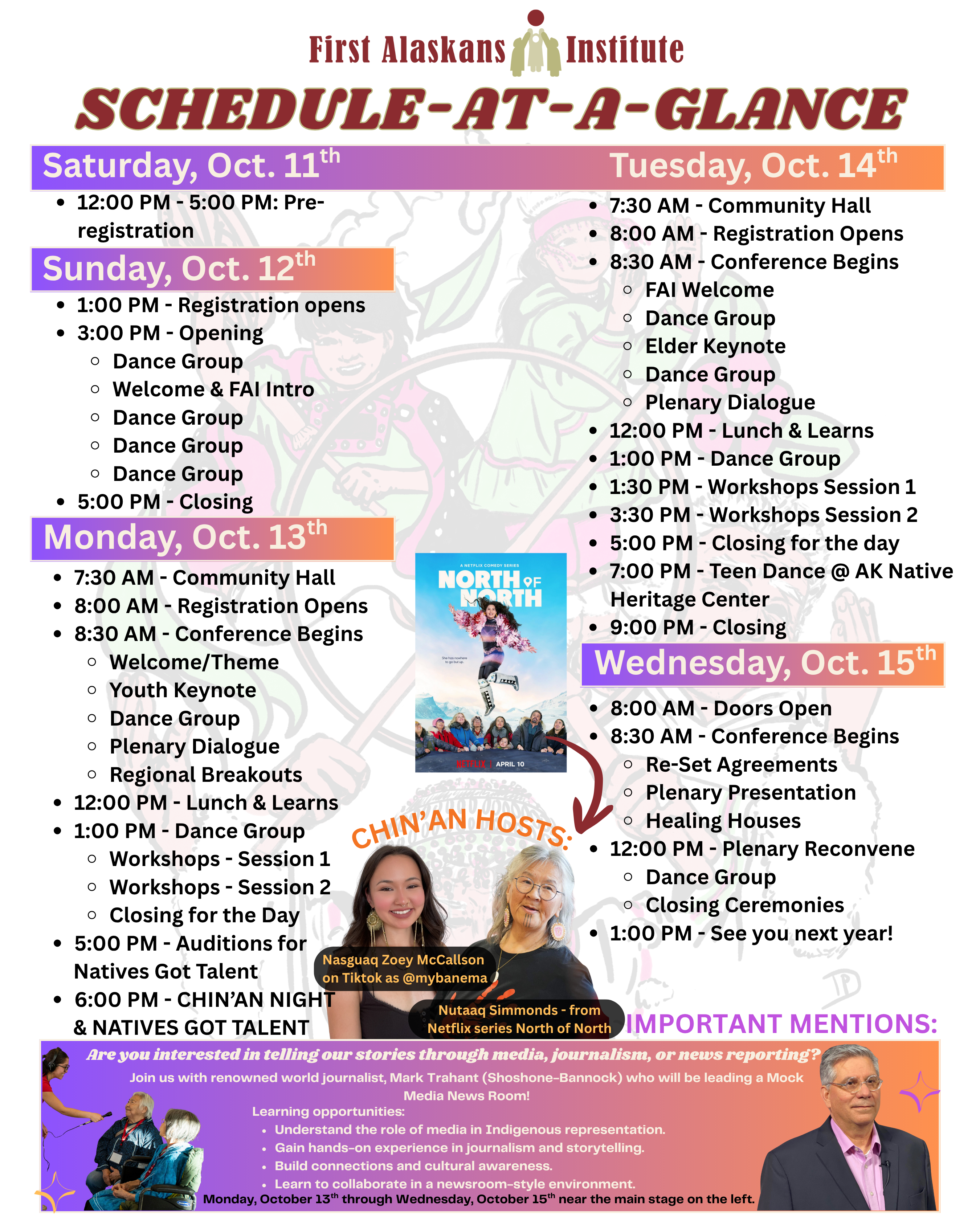First Alaskans Institute is looking for volunteers for our Annual Statewide Elders & Youth Conference! Volunteer dates begin as early as Wednesday, October 8th through the last day of the conference on Wednesday, October 15th. To sign up as a volunteer, please visit: https://tinyurl.com/ey25volunteer